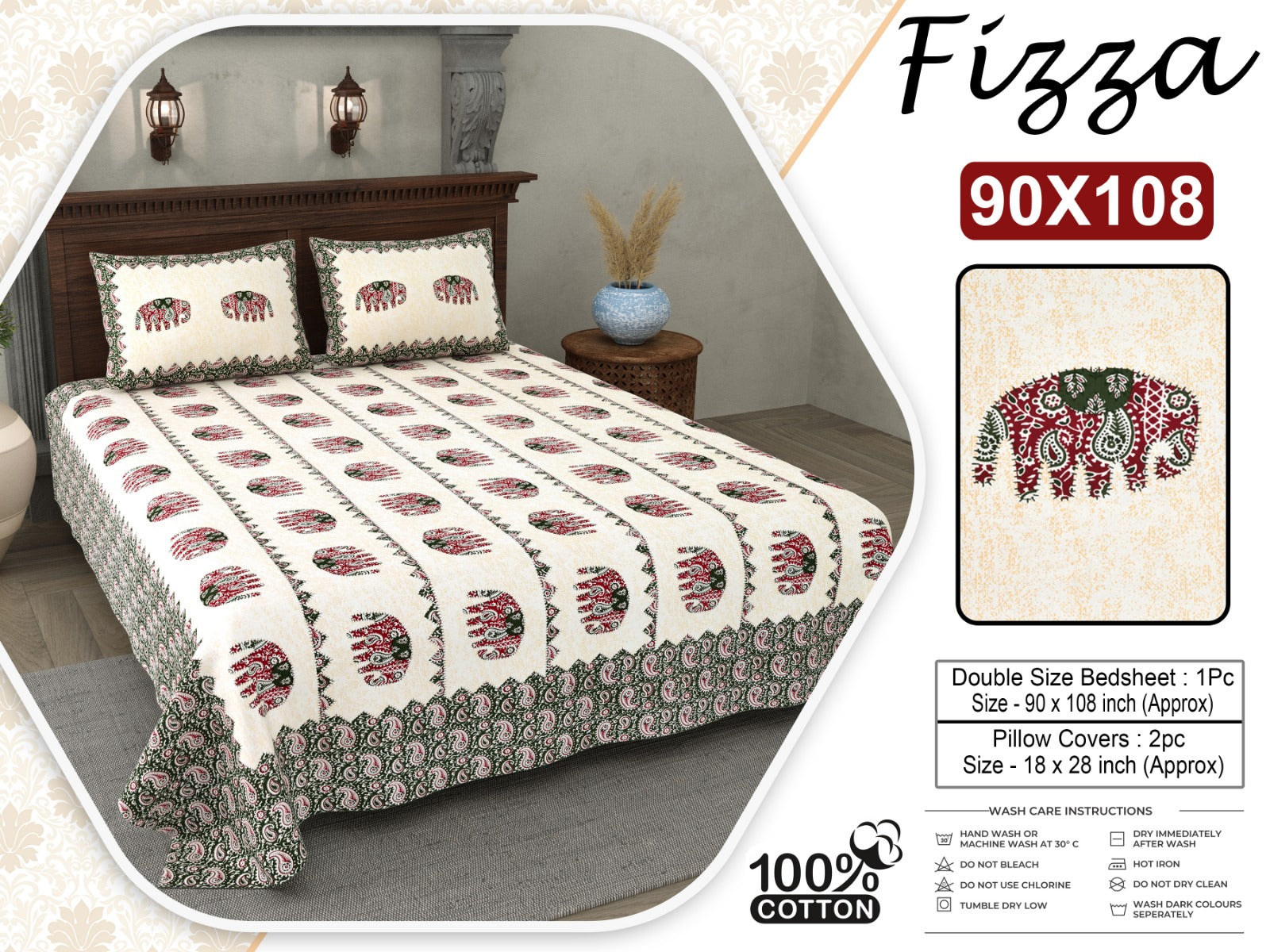 Elephant Print King Size Cotton Bedsheet 90x108 with 2 Pillow Covers | Fizza